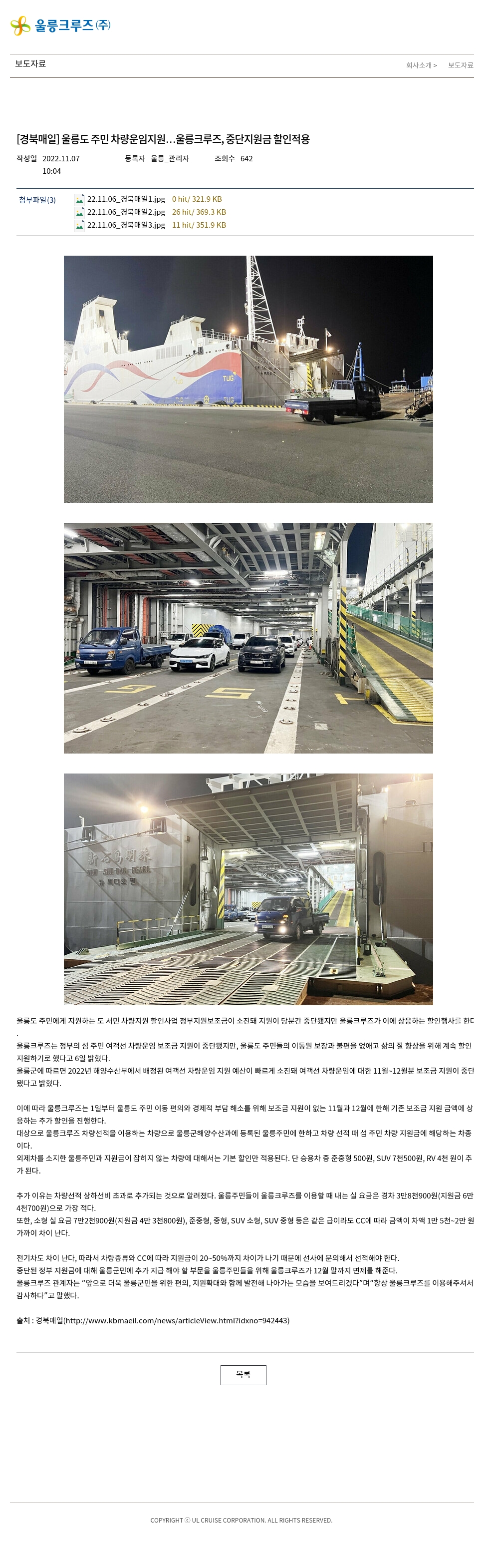 [경북매일] 울릉도 주민 차량운임지원…울릉크루즈, 중단지원금 할인적용