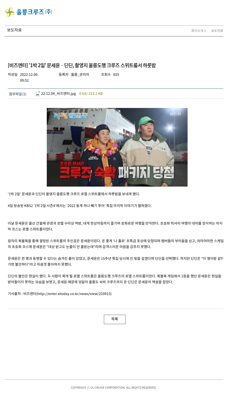 ![[비즈엔터] '1박 2일' 문세윤ㆍ딘딘, 촬영지 울릉도행 크루즈 스위트룸서 하룻밤 < 전체 < 보도자료 < 회사소개 로고](/images/www/common/dokdo_logo.png)