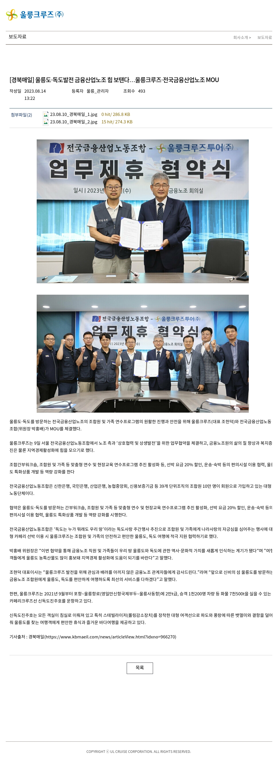 [경북매일] 울릉도·독도발전 금융산업노조 힘 보탠다…울릉크루즈·전국금융산업노조 MOU