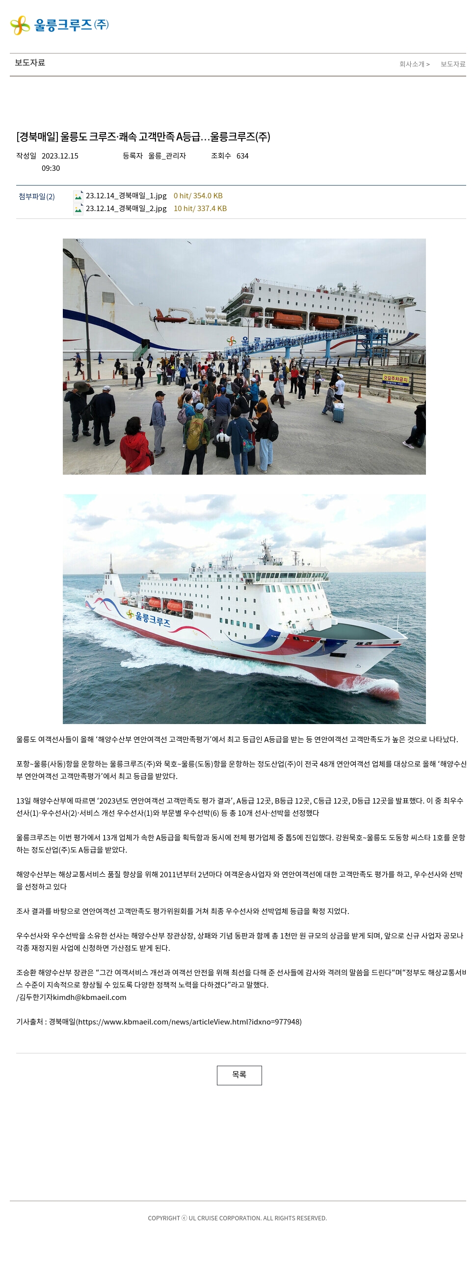 [경북매일] 울릉도 크루즈·쾌속 고객만족 A등급…울릉크루즈(주)