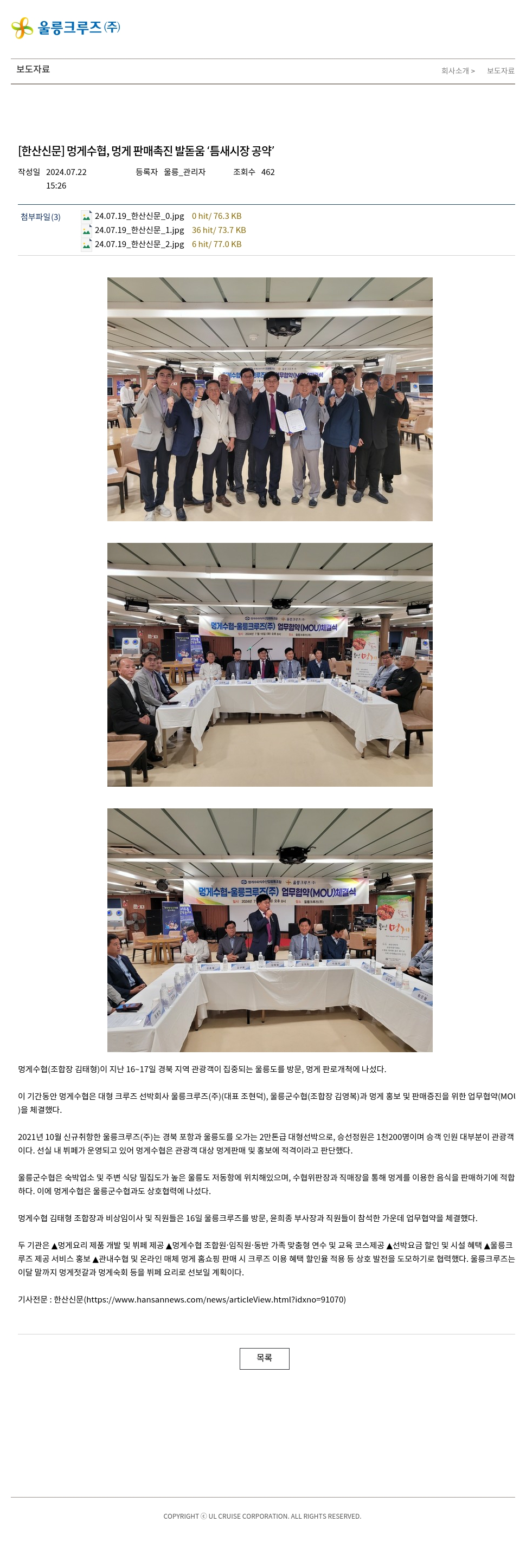 멍게수협 김태형 조합장과 비상임이사 및 직원들은 16일 울릉크루즈를 방문, 윤희종 부사장과 직원들이 참석한 가운데 업무협약을 체결했다.