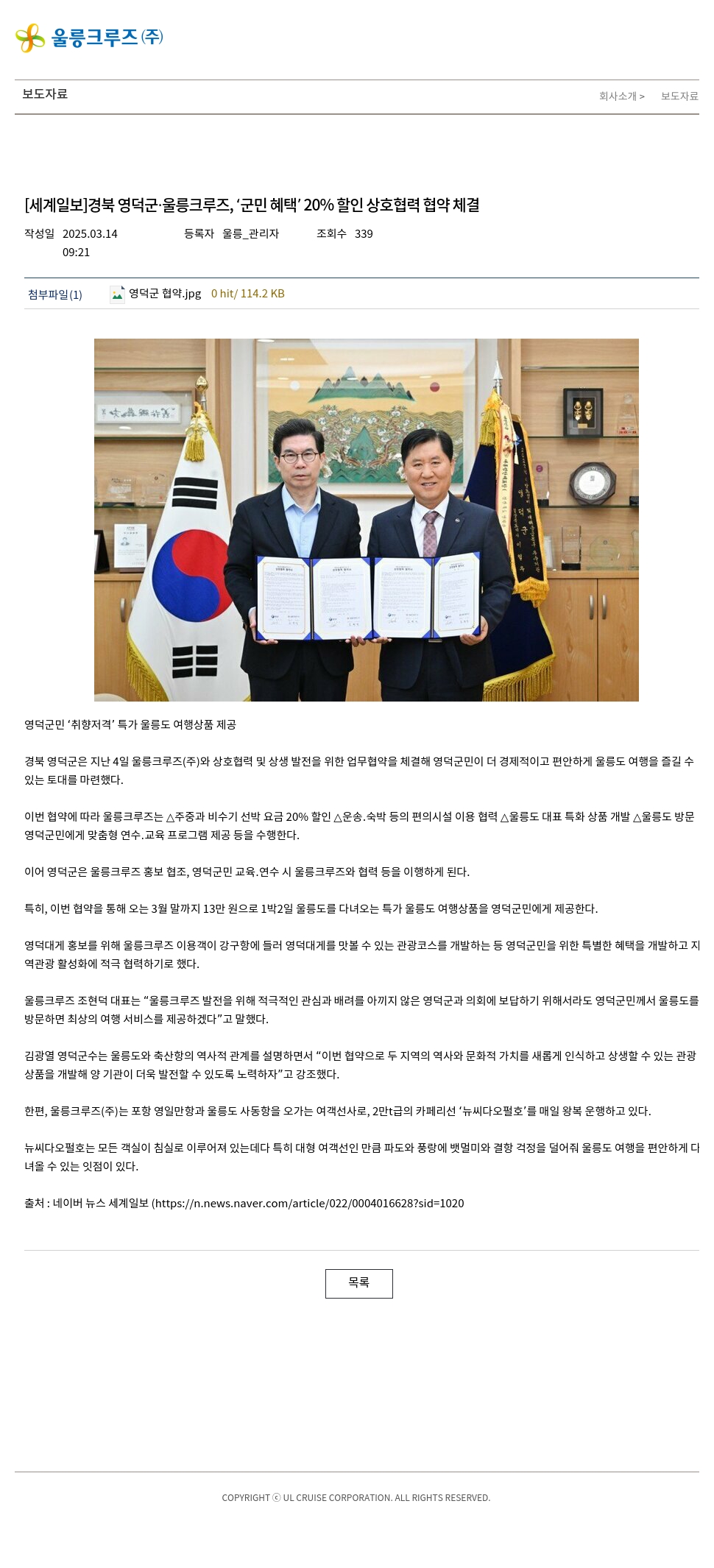 [세계일보]경북 영덕군·울릉크루즈, ‘군민 혜택’ 20% 할인 상호협력 협약 체결