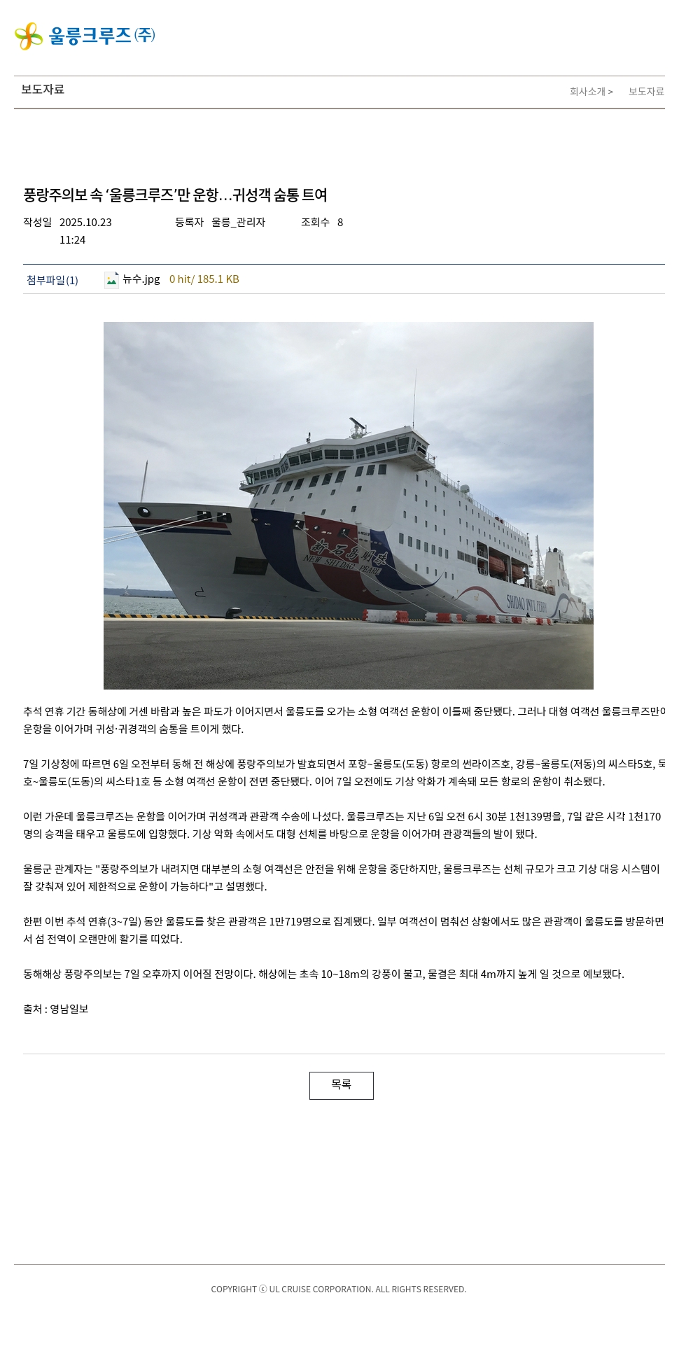 이런 가운데 울릉크루즈는 운항을 이어가며 귀성객과 관광객 수송에 나섰다. 울릉크루즈는 지난 6일 오전 6시 30분 1천139명을, 7일 같은 시각 1천170명의 승객을 태우고 울릉도에 입항했다. 기상 악화 속에서도 대형 선체를 바탕으로 운항을 이어가며 관광객들의 발이 됐다.