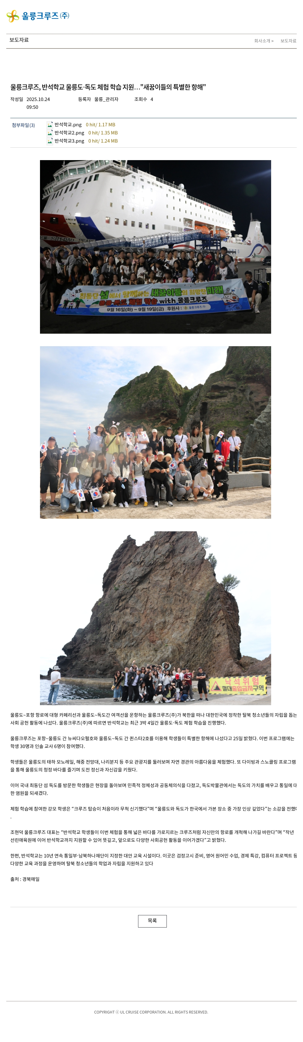 울릉도~포항 항로에 대형 카페리선과 울릉도~독도간 여객선을 운항하는 울릉크루즈(주)가 북한을 떠나 대한민국에 정착한 탈북 청소년들의 자립을 돕는 사회 공헌 활동에 나섰다. 울릉크루즈(주)에 따르면 반석학교는 최근 3박 4일간 울릉도·독도 체험 학습을 진행했다.