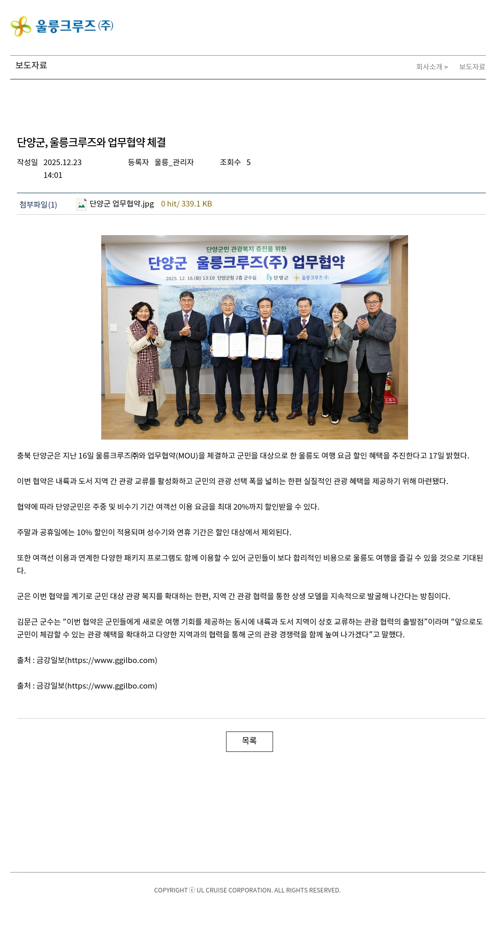 충북 단양군은 지난 16일 울릉크루즈㈜와 업무협약(MOU)을 체결하고 군민을 대상으로 한 울릉도 여행 요금 할인 혜택을 추진한다고 17일 밝혔다.
