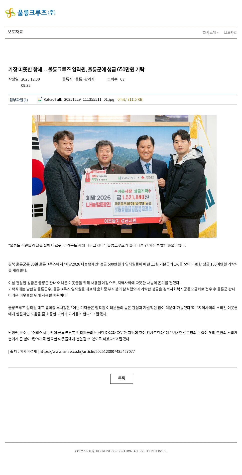 남한권 군수는 "연말연시를 맞아 울릉크루즈 임직원들의 넉넉한 마음과 따뜻한 지원에 깊이 감사드린다"며 "보내주신 온정의 손길이 우리 주변의 소외계층에게 큰 힘이 됐으며 꼭 필요한 이웃들에게 전달될 수 있도록 하겠다"고 말했다