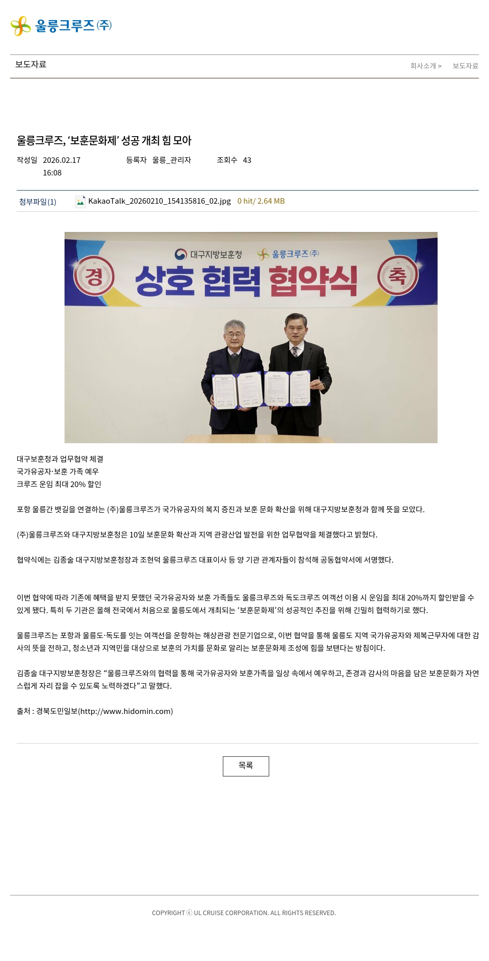 울릉크루즈는 포항과 울릉도·독도를 잇는 여객선을 운항하는 해상관광 전문기업으로, 이번 협약을 통해 울릉도 지역 국가유공자와 제복근무자에 대한 감사의 뜻을 전하고, 청소년과 지역민을 대상으로 보훈의 가치를 문화로 알리는 보훈문화제 조성에 힘을 보탠다는 방침이다.