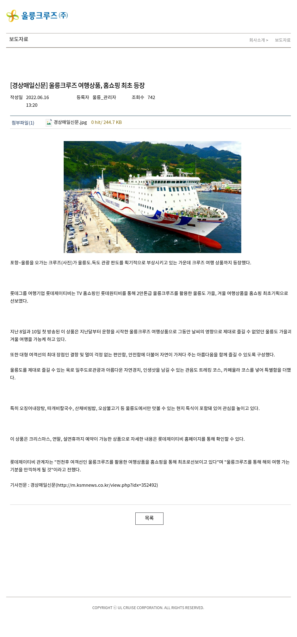 [경상매일신문] 울릉크루즈 여행상품, 홈쇼핑 최초 등장