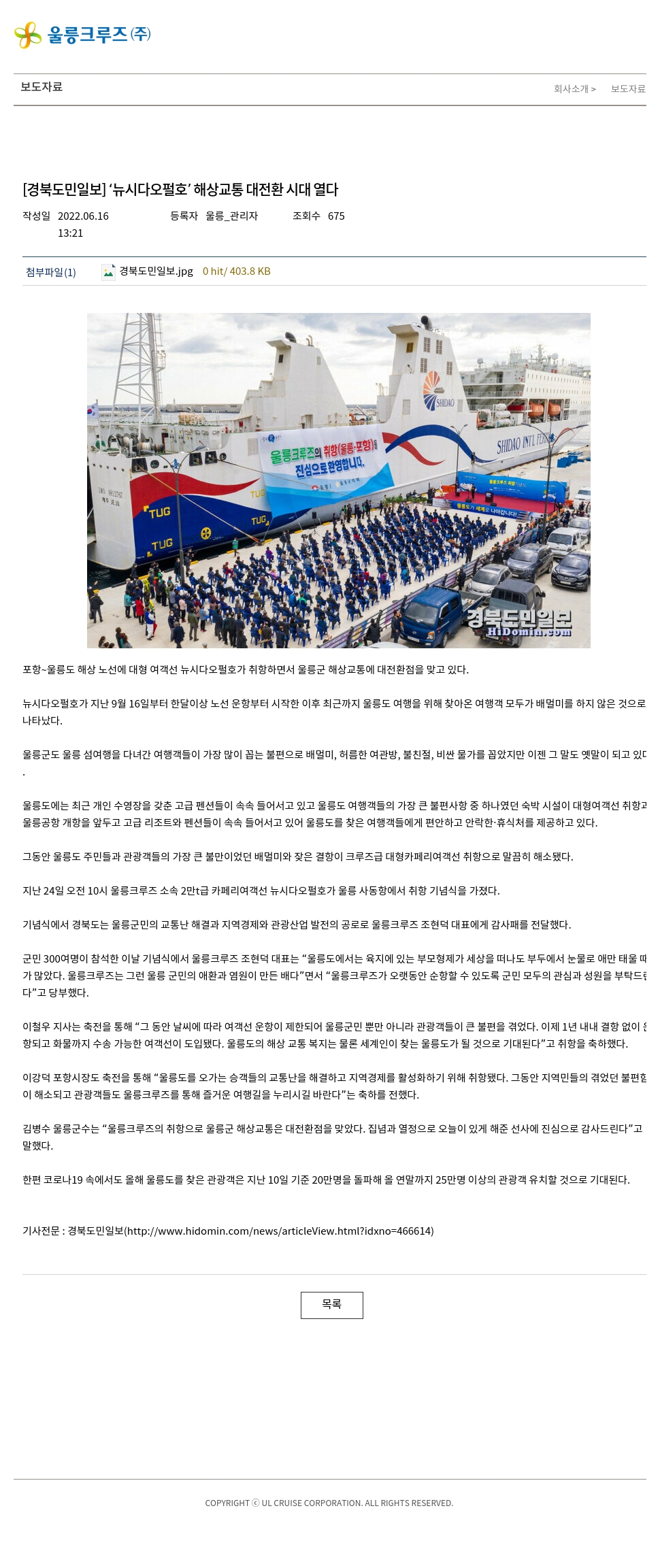 이강덕 포항시장도 축전을 통해 “울릉도를 오가는 승객들의 교통난을 해결하고 지역경제를 활성화하기 위해 취항됐다. 그동안 지역민들의 겪었던 불편함이 해소되고 관광객들도 울릉크루즈를 통해 즐거운 여행길을 누리시길 바란다”는 축하를 전했다.