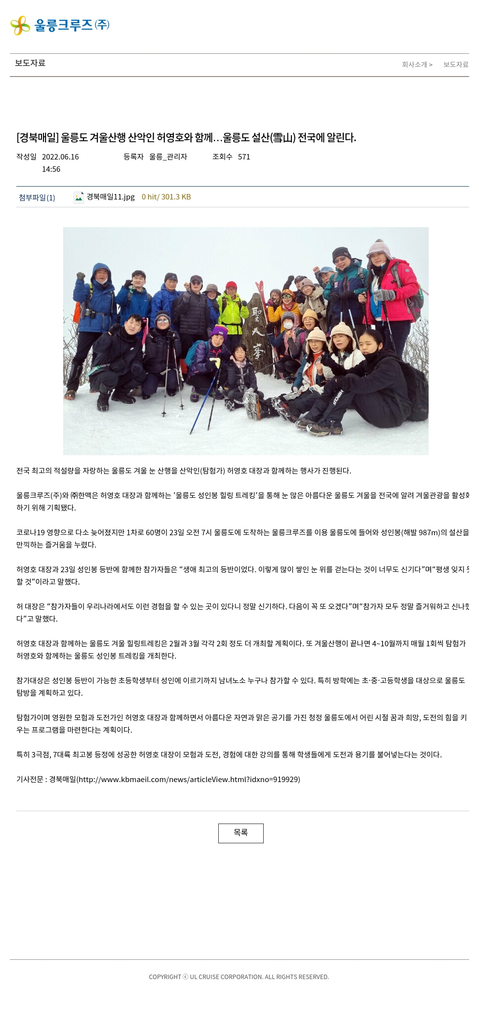 [경북매일] 울릉도 겨울산행 산악인 허영호와 함께…울릉도 설산(雪山) 전국에 알린다.