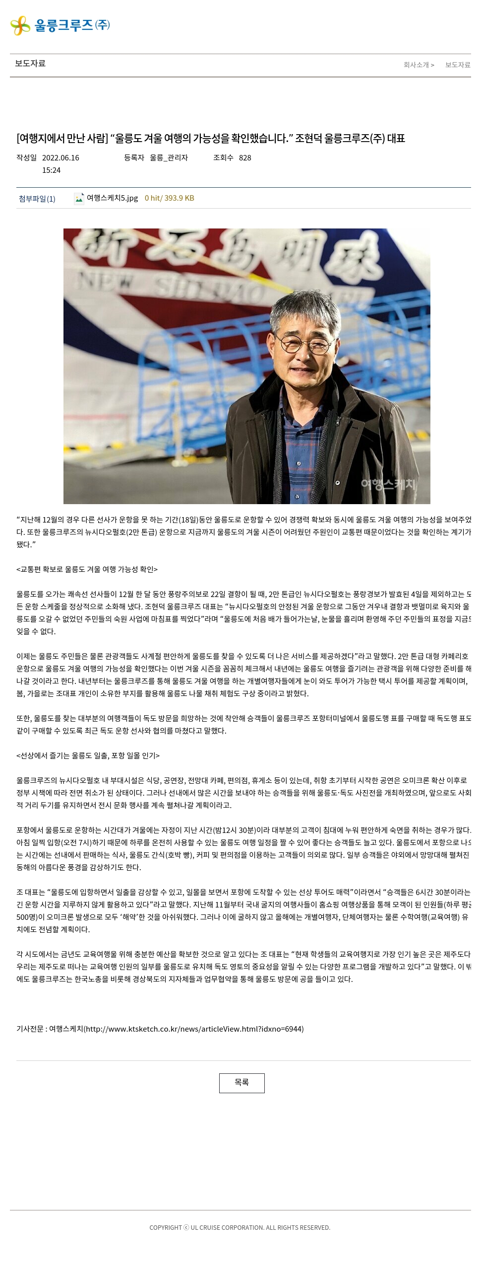 조 대표는 “울릉도에 입항하면서 일출을 감상할 수 있고, 일몰을 보면서 포항에 도착할 수 있는 선상 투어도 매력”이라면서 “승객들은 6시간 30분이라는 긴 운항 시간을 지루하지 않게 활용하고 있다”라고 말했다. 지난해 11월부터 국내 굴지의 여행사들이 홈쇼핑 여행상품을 통해 모객이 된 인원들(하루 평균 500명)이 오미크론 발생으로 모두 ‘해약’한 것을 아쉬워했다. 그러나 이에 굴하지 않고 올해에는 개별여행자, 단체여행자는 물론 수학여행(교육여행) 유치에도 전념할 계획이다.