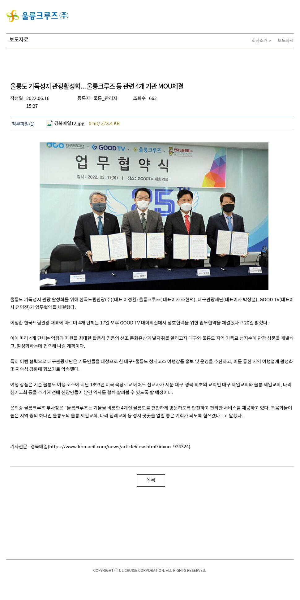 울릉도 기독성지 관광 활성화를 위해 한국드림관광(주)(대표 이정환) 울릉크루즈( 대표이사 조현덕), 대구관광재단(대표이사 박상철), GOOD TV(대표이사 전명전)가 업무협약을 체결했다.