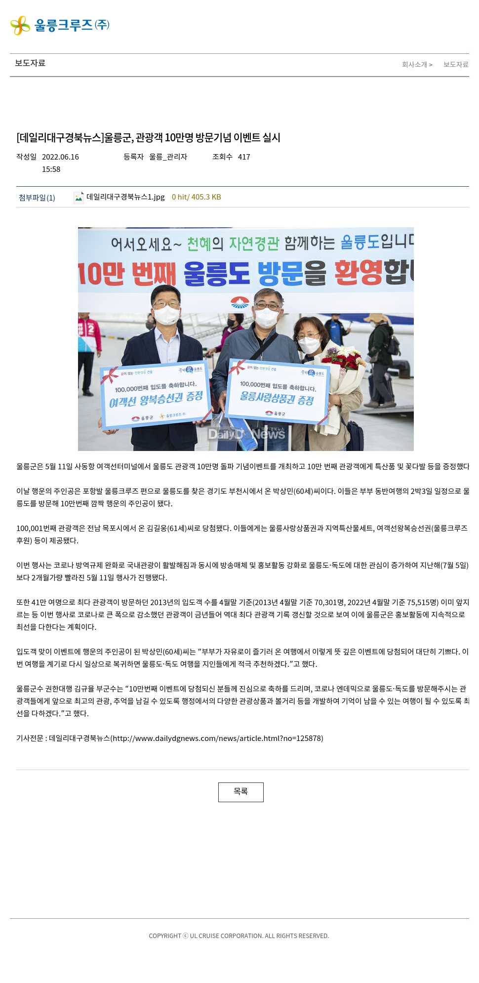 이날 행운의 주인공은 포항발 울릉크루즈 편으로 울릉도를 찾은 경기도 부천시에서 온 박상민(60세)씨이다. 이들은 부부 동반여행의 2박3일 일정으로 울릉도를 방문해 10만번째 깜짝 행운의 주인공이 됐다.