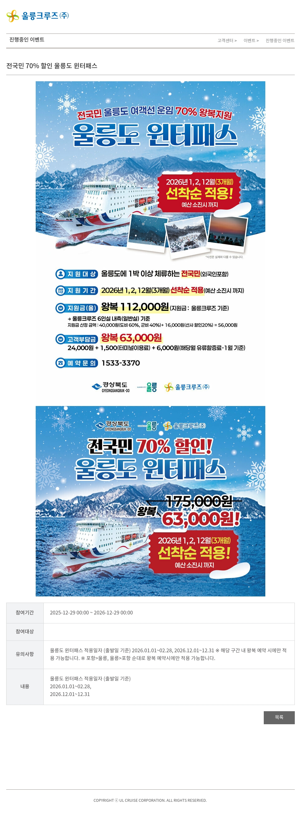 | 내용 | 울릉도 윈터패스 적용일자 (출발일 기준) 2026.01.01~02.28, 2026.12.01~12.31 |