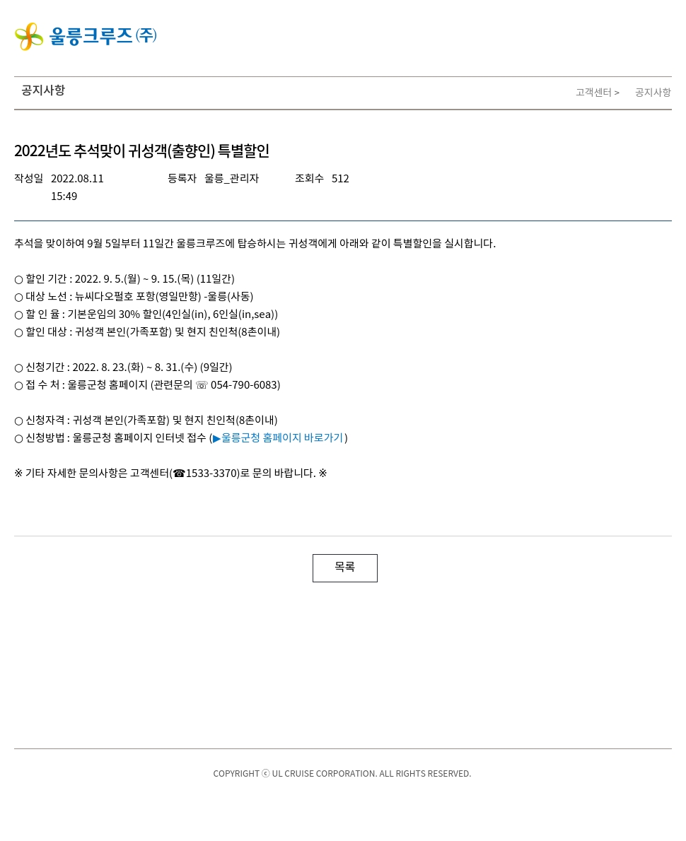 추석을 맞이하여 9월 5일부터 11일간 울릉크루즈에 탑승하시는 귀성객에게 아래와 같이 특별할인을 실시합니다.