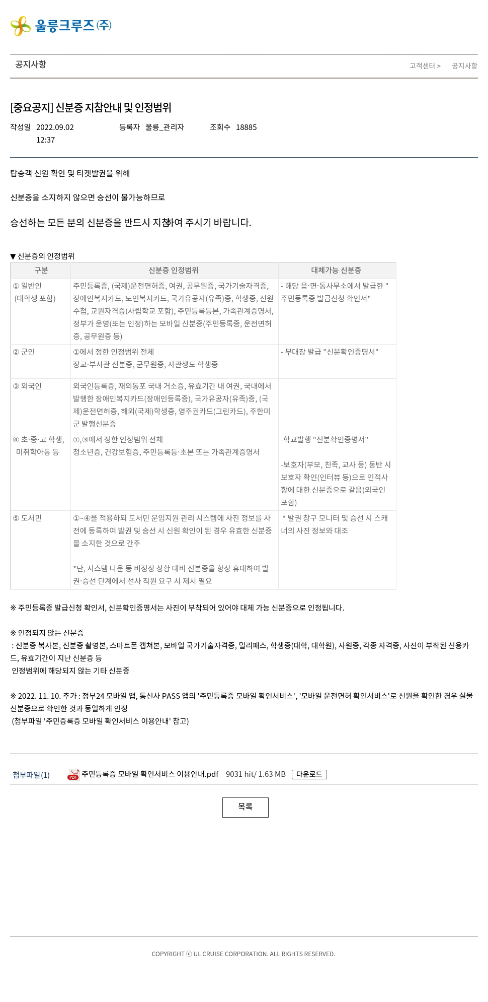 승선하는 모든 분의 신분증을 반드시 지참하여 주시기 바랍니다.