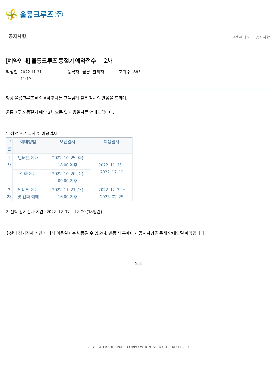 울릉크루즈 동절기 예약 2차 오픈 및 이용일자를 안내드립니다.