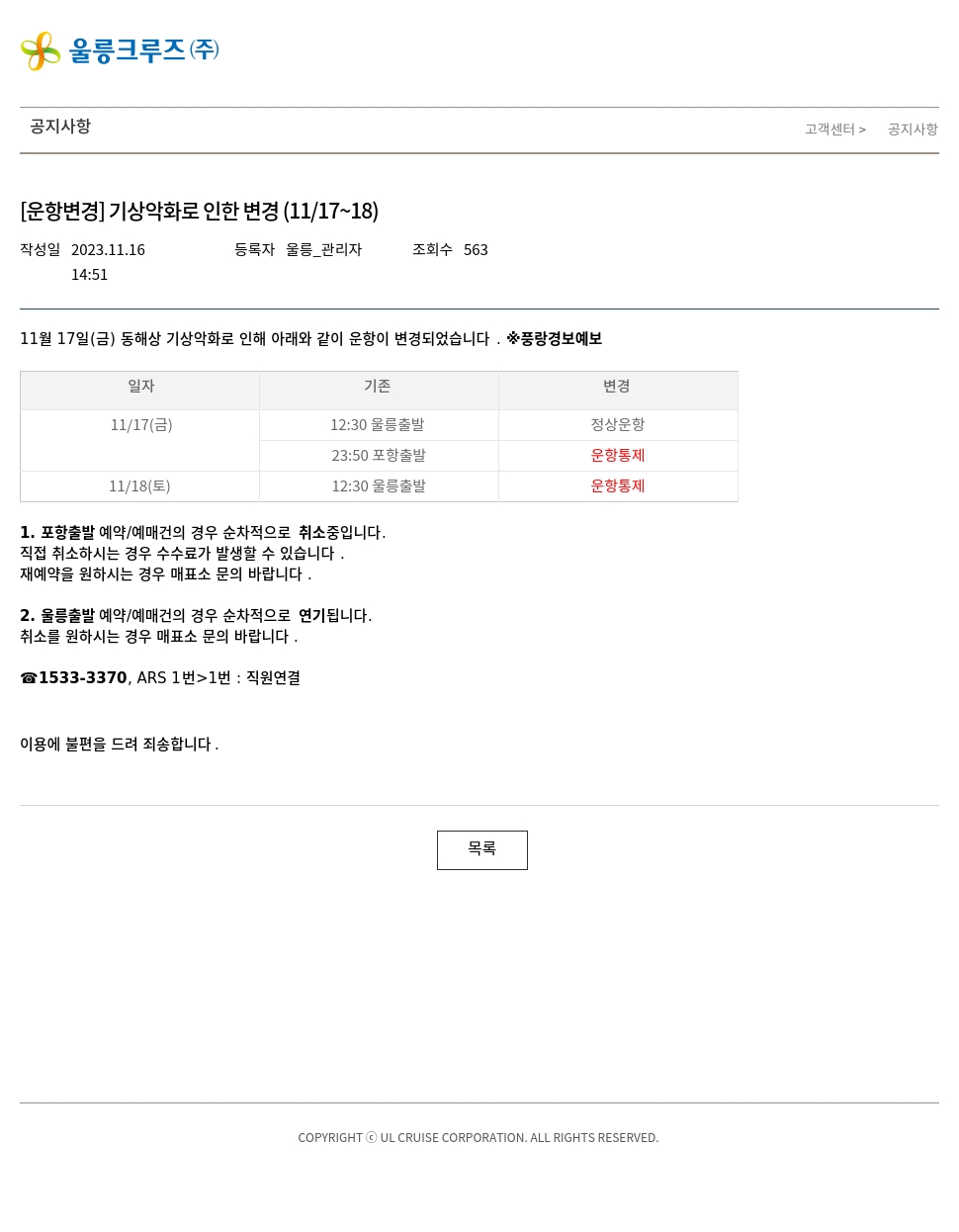 11월 17일(금) 동해상 기상악화로 인해 아래와 같이 운항이 변경되었습니다. ※풍랑경보예보