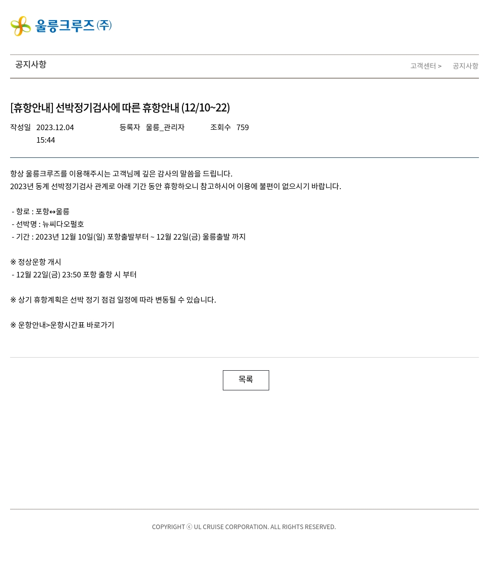 2023년 동계 선박정기검사 관계로 아래 기간 동안 휴항하오니 참고하시어 이용에 불편이 없으시기 바랍니다.