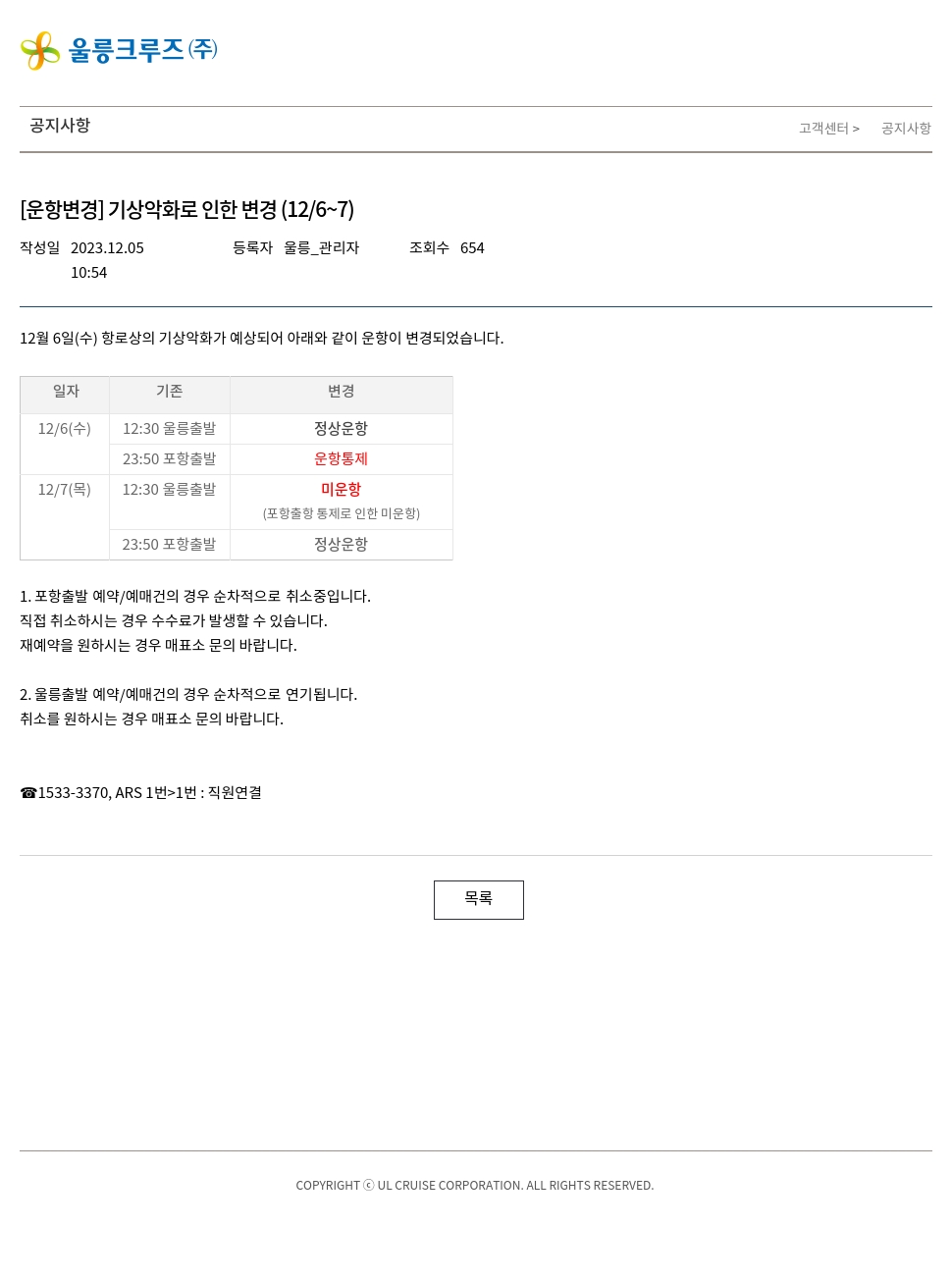 12월 6일(수) 항로상의 기상악화가 예상되어 아래와 같이 운항이 변경되었습니다.