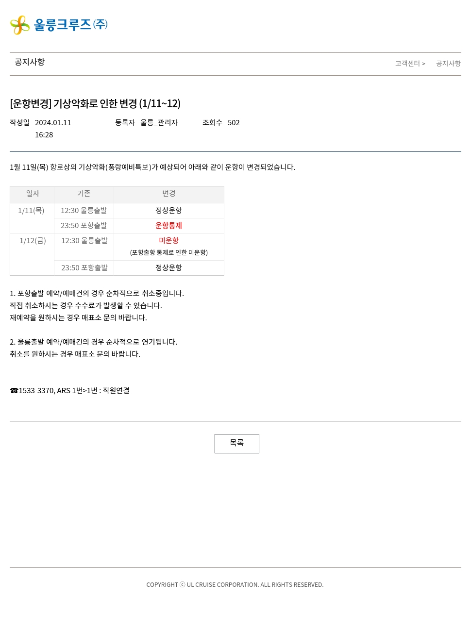 1월 11일(목) 항로상의 기상악화(풍랑예비특보)가 예상되어 아래와 같이 운항이 변경되었습니다.