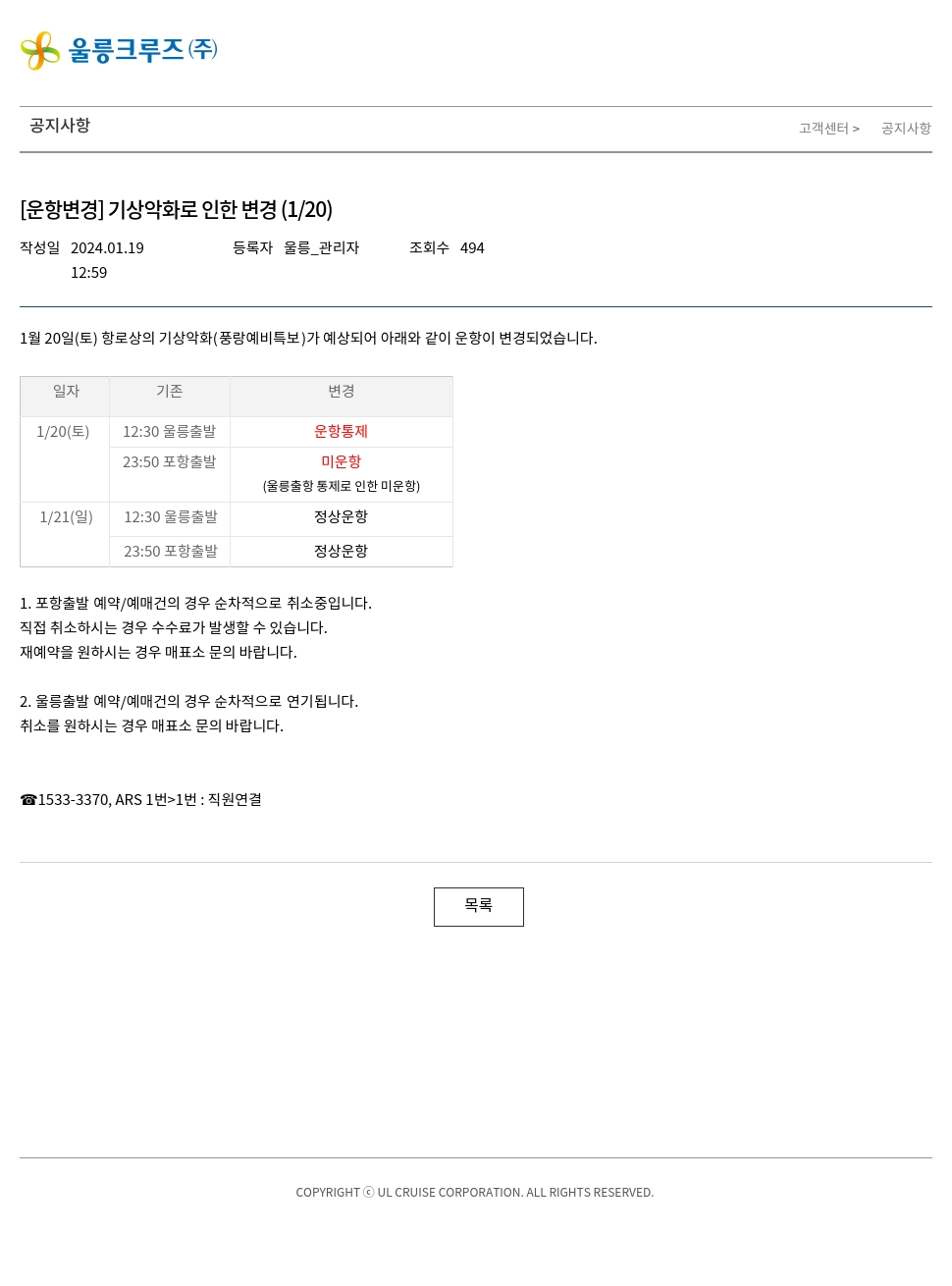 1월 20일(토) 항로상의 기상악화(풍랑예비특보)가 예상되어 아래와 같이 운항이 변경되었습니다.