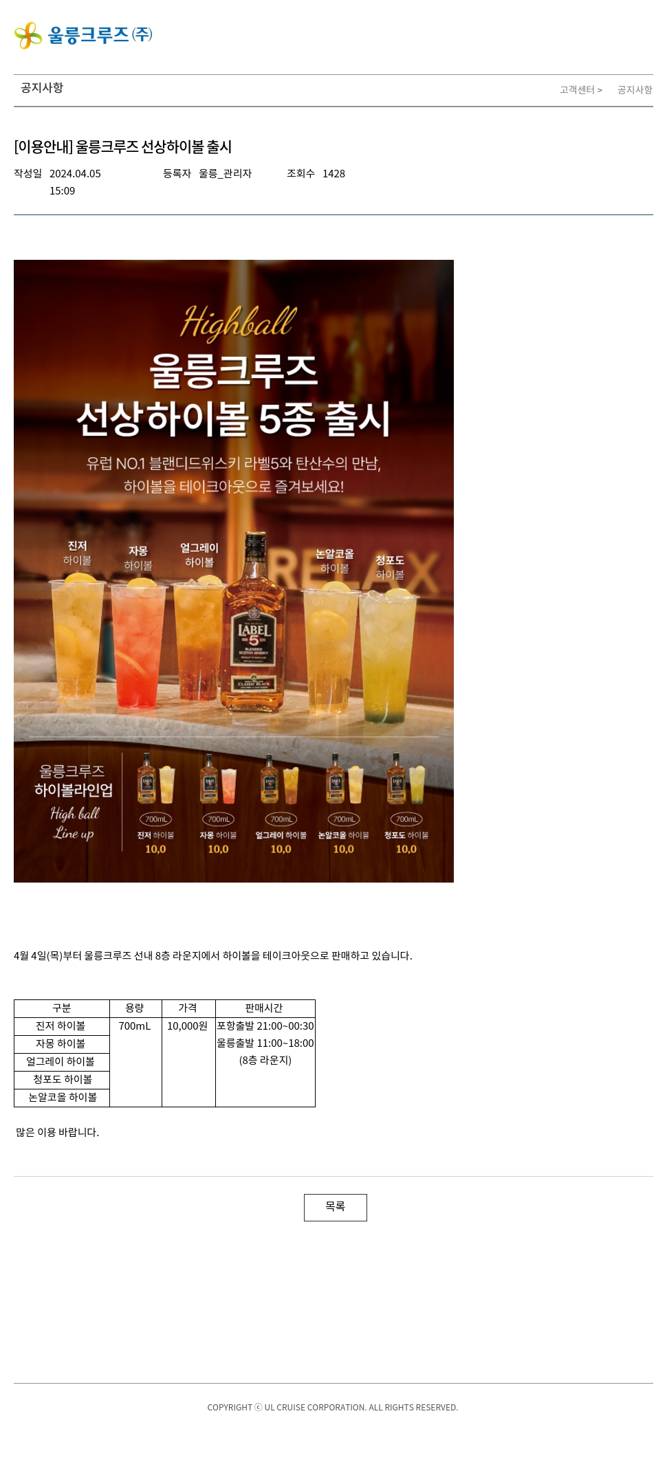 [이용안내] 울릉크루즈 선상하이볼 출시