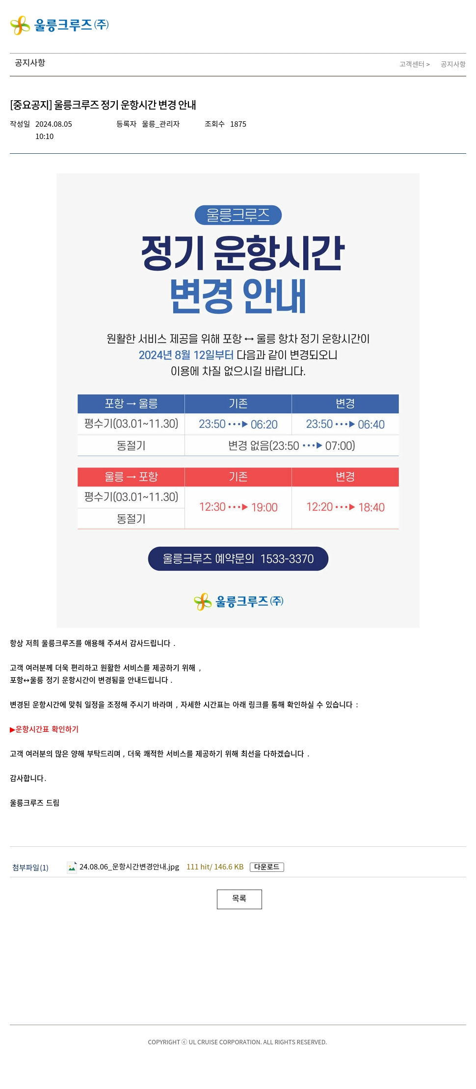 [중요공지] 울릉크루즈 정기 운항시간 변경 안내
