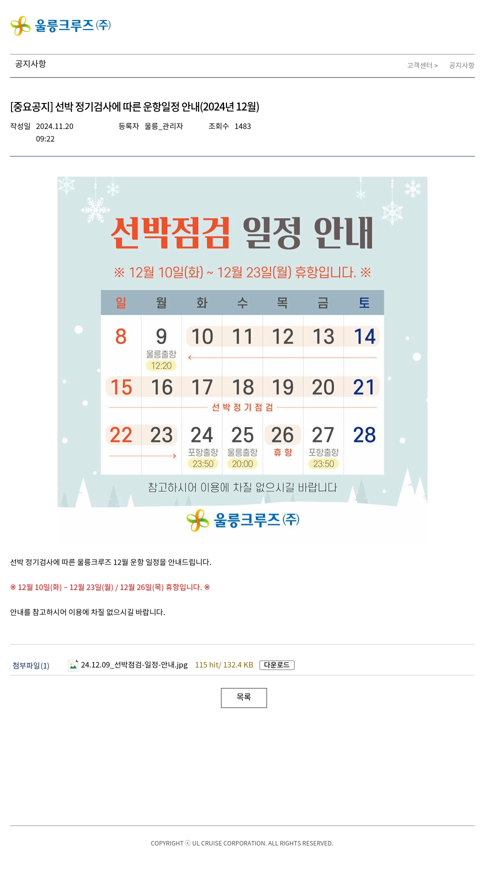 선박 정기검사에 따른 울릉크루즈 12월 운항 일정을 안내드립니다.