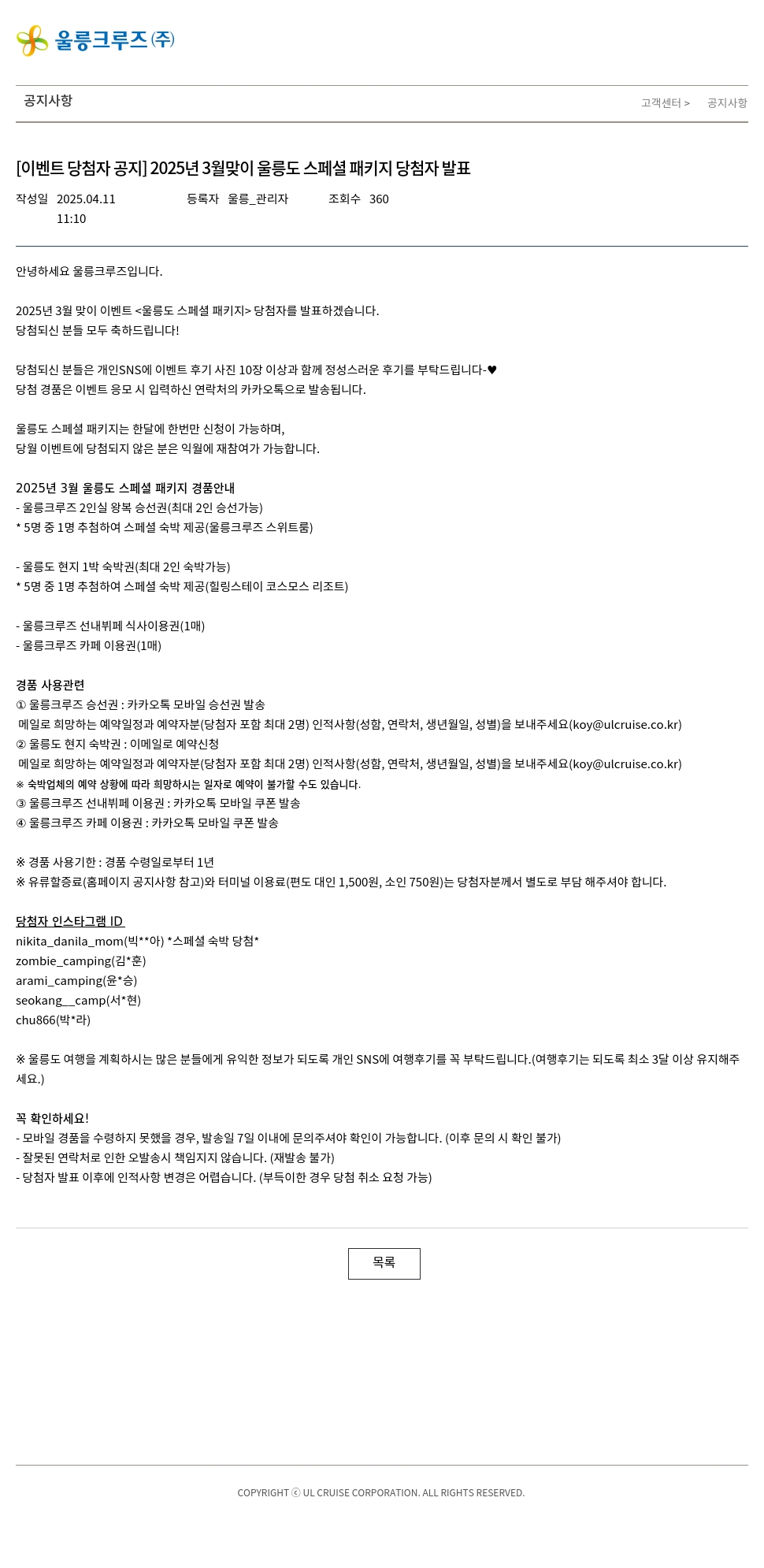 [이벤트 당첨자 공지] 2025년 3월맞이 울릉도 스페셜 패키지 당첨자 발표