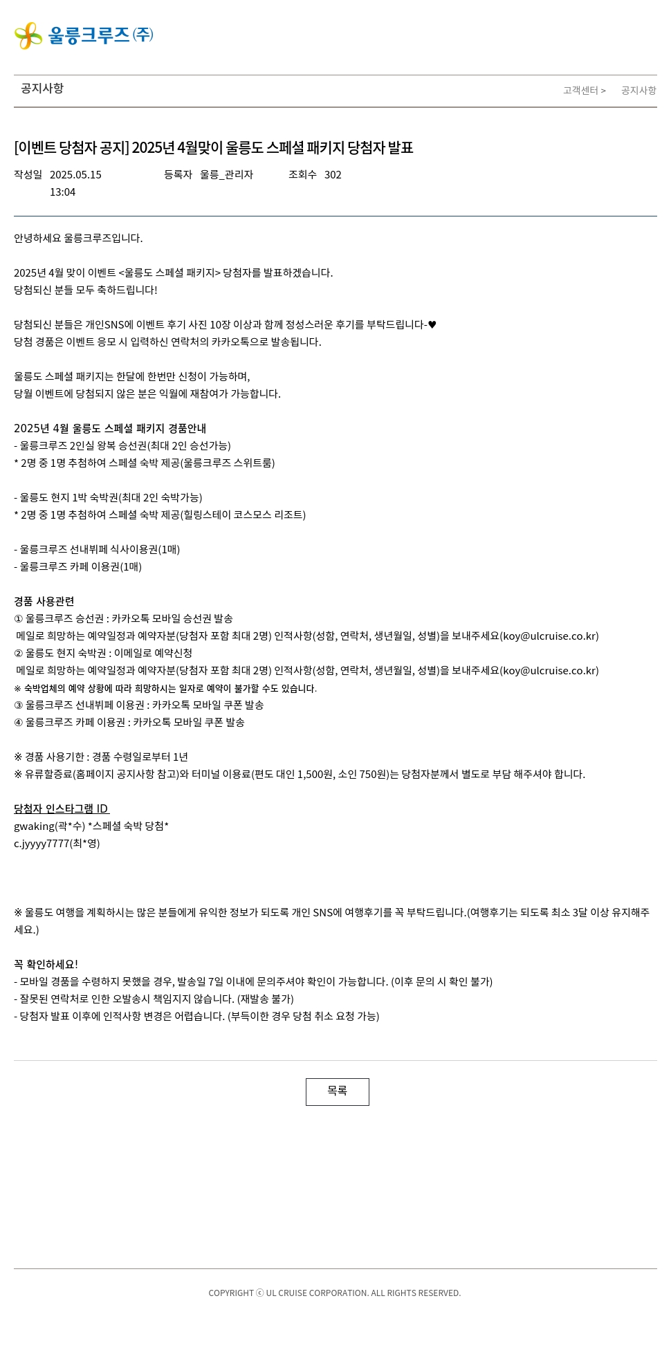 [이벤트 당첨자 공지] 2025년 4월맞이 울릉도 스페셜 패키지 당첨자 발표