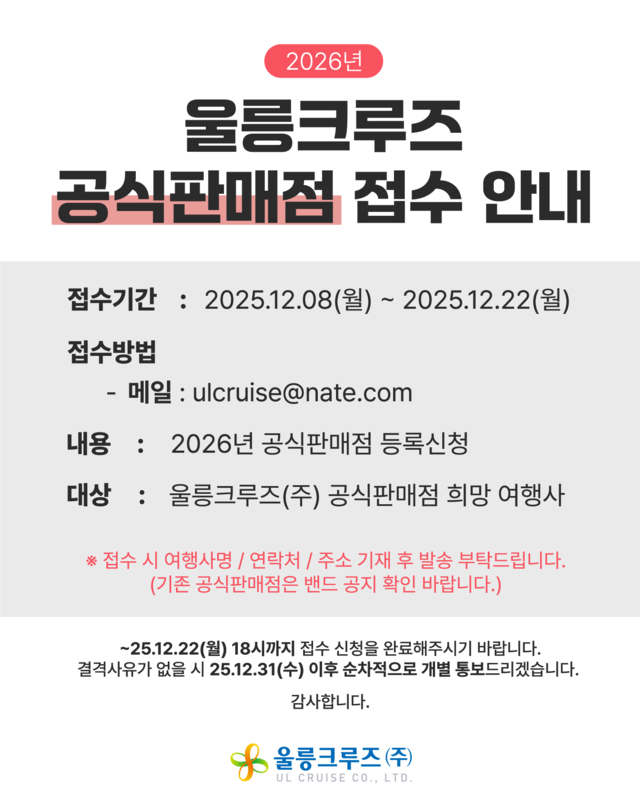 울릉크루즈(주)에서는 2026년 공식판매점 등록 신청을 아래와 같이 접수받습니다.