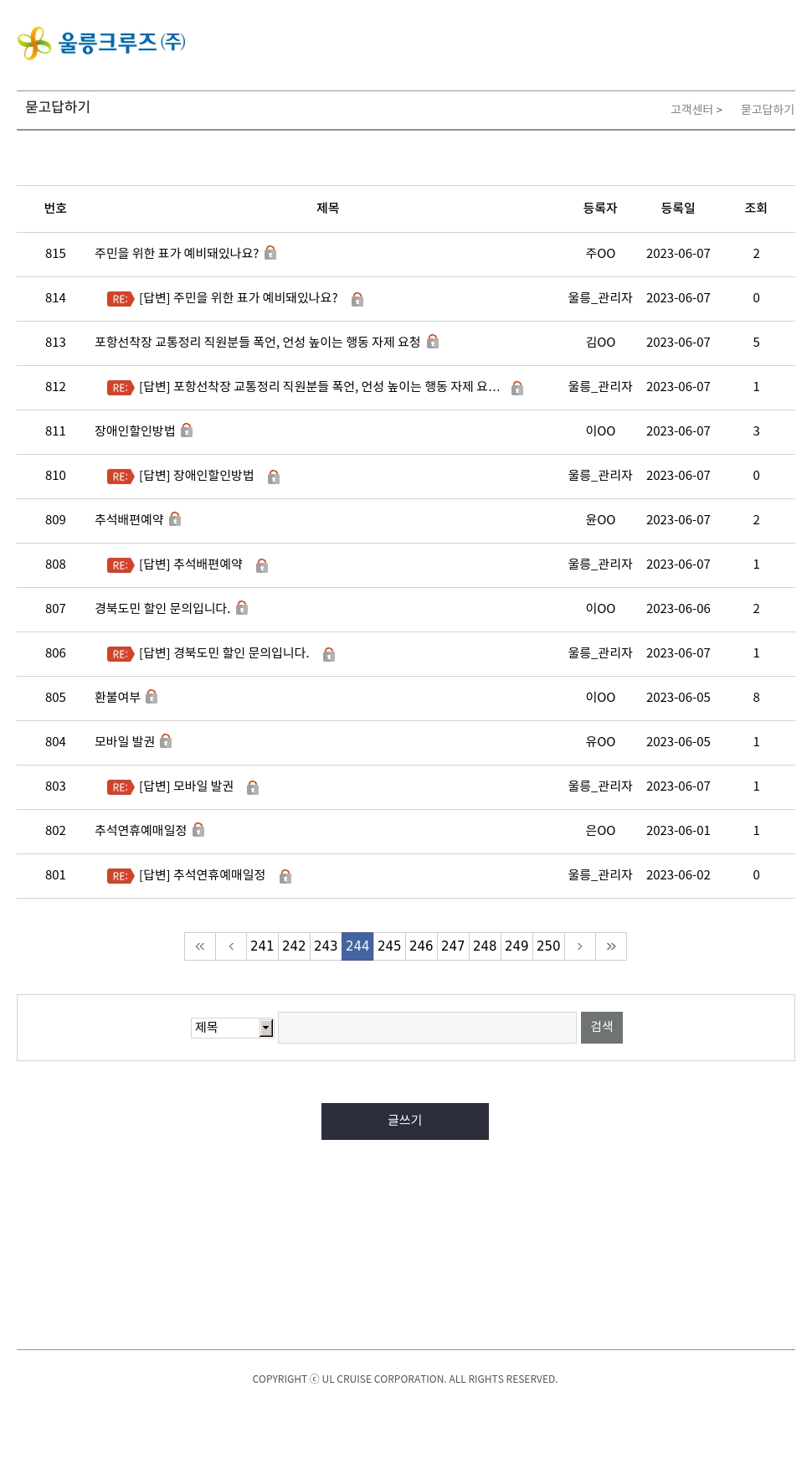 | 808 | [답변글][답변] 추석배편예약비공개글 | 울릉_관리자 | 2023-06-07 | 1 |