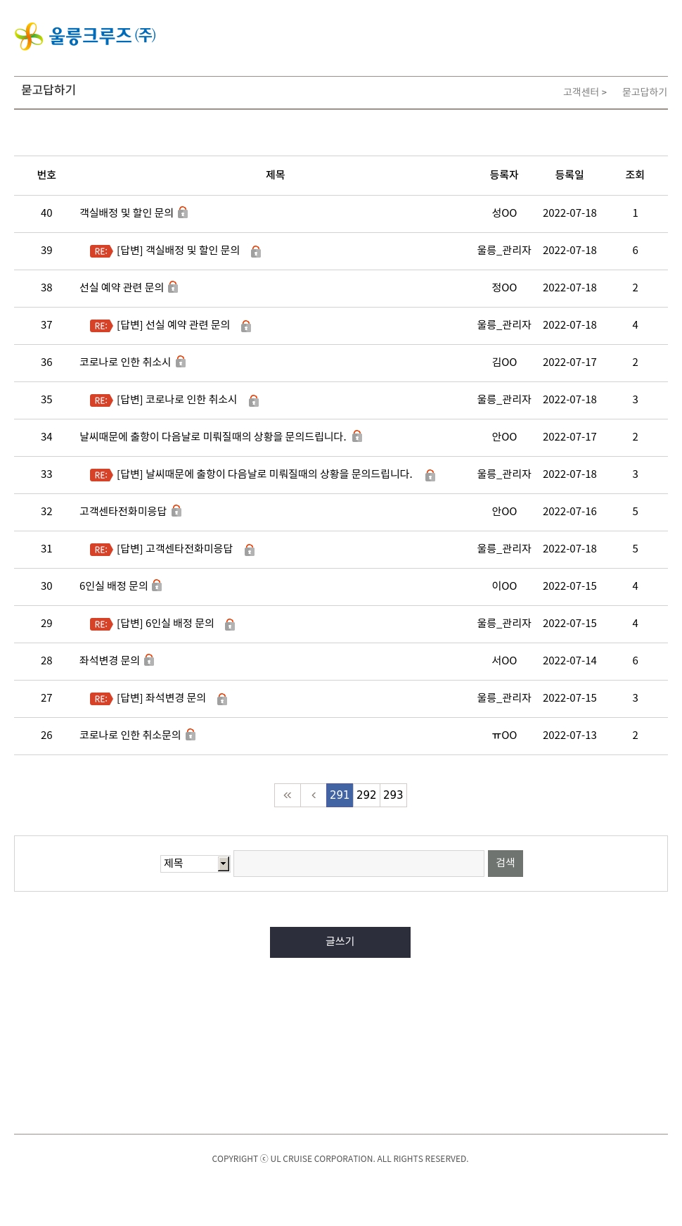 38 | 선실 예약 관련 문의비공개글 | 정OO | 2022-07-18 | 2 |