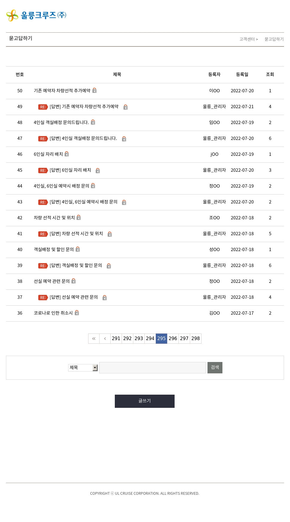 | 38 | 선실 예약 관련 문의비공개글 | 정OO | 2022-07-18 | 2 |