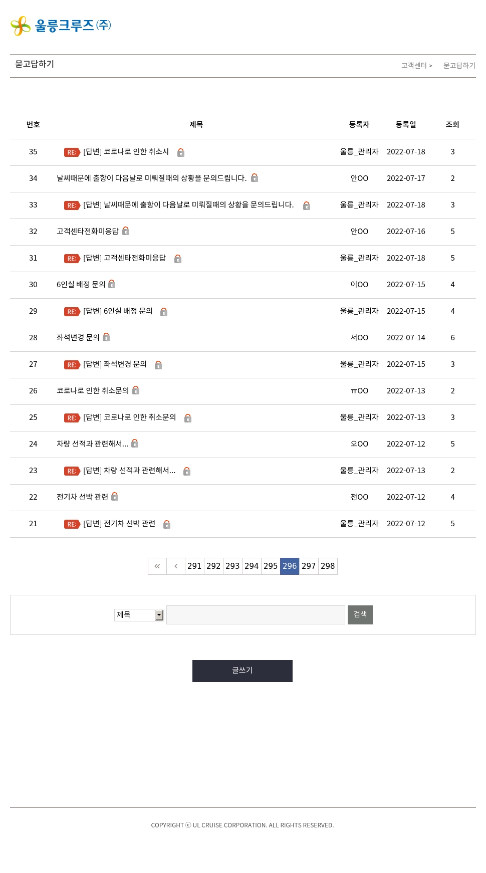 | 35 | [답변글][답변] 코로나로 인한 취소시비공개글 | 울릉_관리자 | 2022-07-18 | 3 |