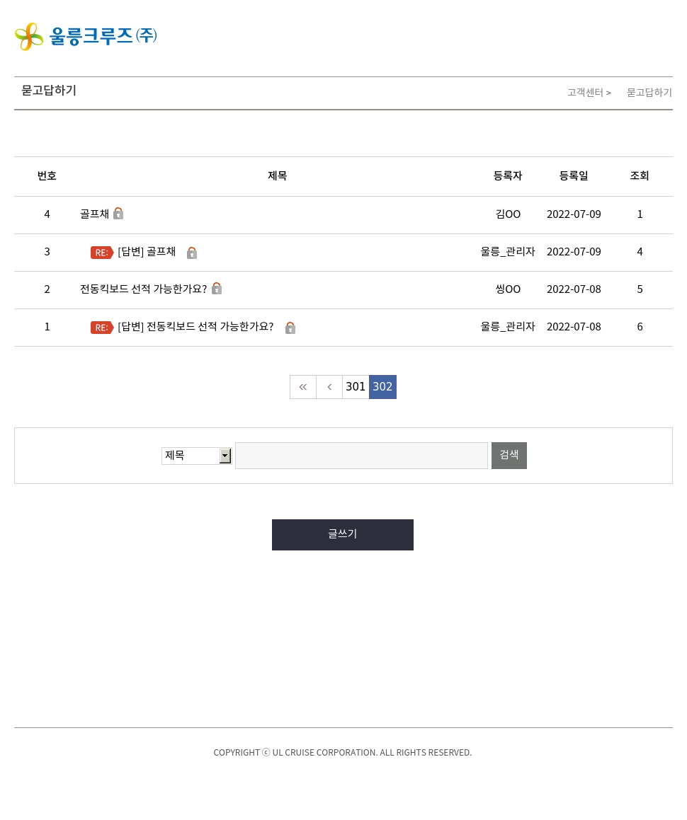 | 3 | [답변글][답변] 골프채비공개글 | 울릉_관리자 | 2022-07-09 | 4 |