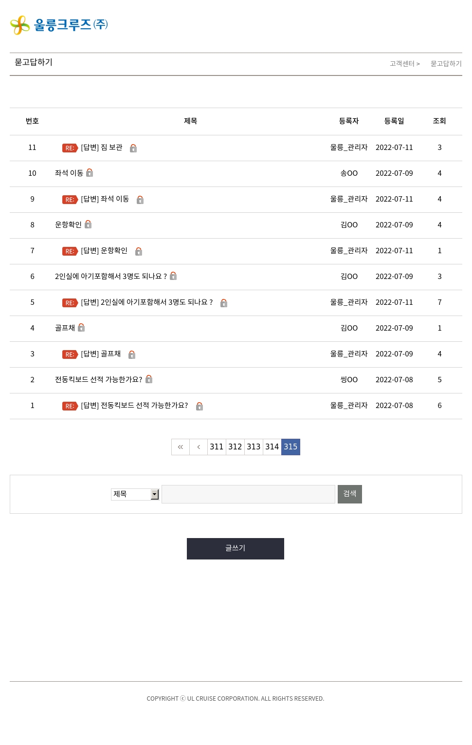 | 7 | [답변글][답변] 운항확인비공개글 | 울릉_관리자 | 2022-07-11 | 1 |