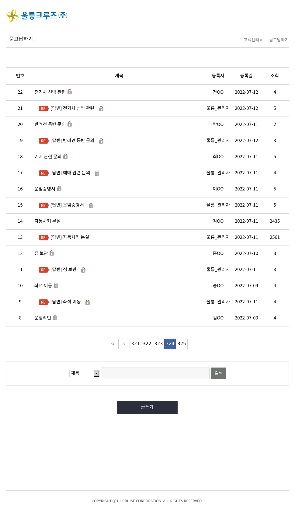 | 17 | [답변글][답변] 예매 관련 문의비공개글 | 울릉_관리자 | 2022-07-11 | 4 |