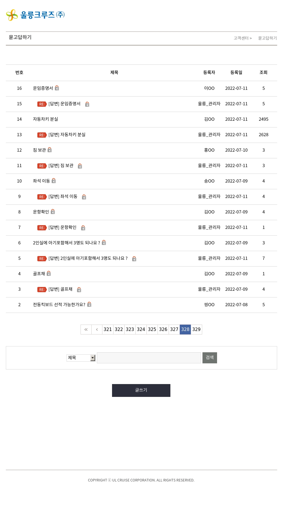 | 7 | [답변글][답변] 운항확인비공개글 | 울릉_관리자 | 2022-07-11 | 1 |
