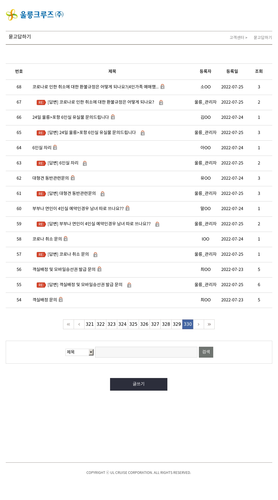 | 56 | 객실배정 및 모바일승선권 발급 문의비공개글 | 최OO | 2022-07-23 | 5 |