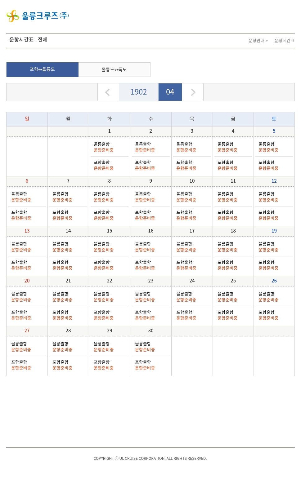 날짜별 일정 확인 1902년 04월 4232건, 본 데이터는 일요일, 월요일, 화요일, 수요일, 목요일, 금요일, 토요일로 구성되어 있습니다.
