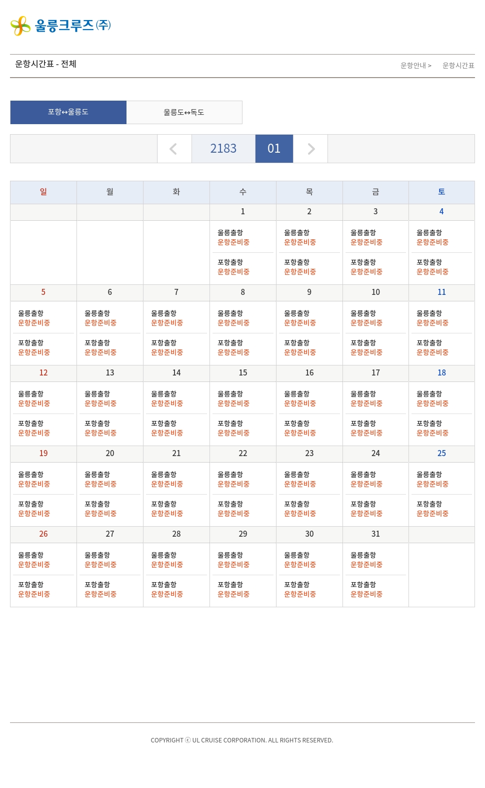 날짜별 일정 확인 2183년 01월 4232건, 본 데이터는 일요일, 월요일, 화요일, 수요일, 목요일, 금요일, 토요일로 구성되어 있습니다.