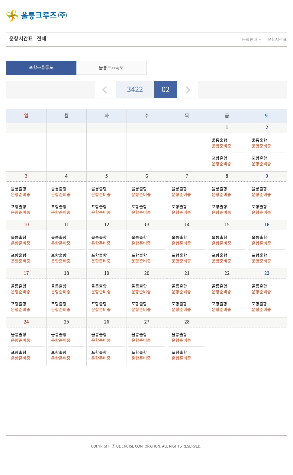 날짜별 일정 확인 3422년 02월 4232건, 본 데이터는 일요일, 월요일, 화요일, 수요일, 목요일, 금요일, 토요일로 구성되어 있습니다.