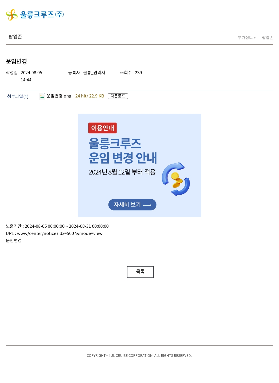 노출기간 : 2024-08-05 00:00:00 ~ 2024-08-31 00:00:00URL : www/center/notice?idx=5007&mode=view운임변경