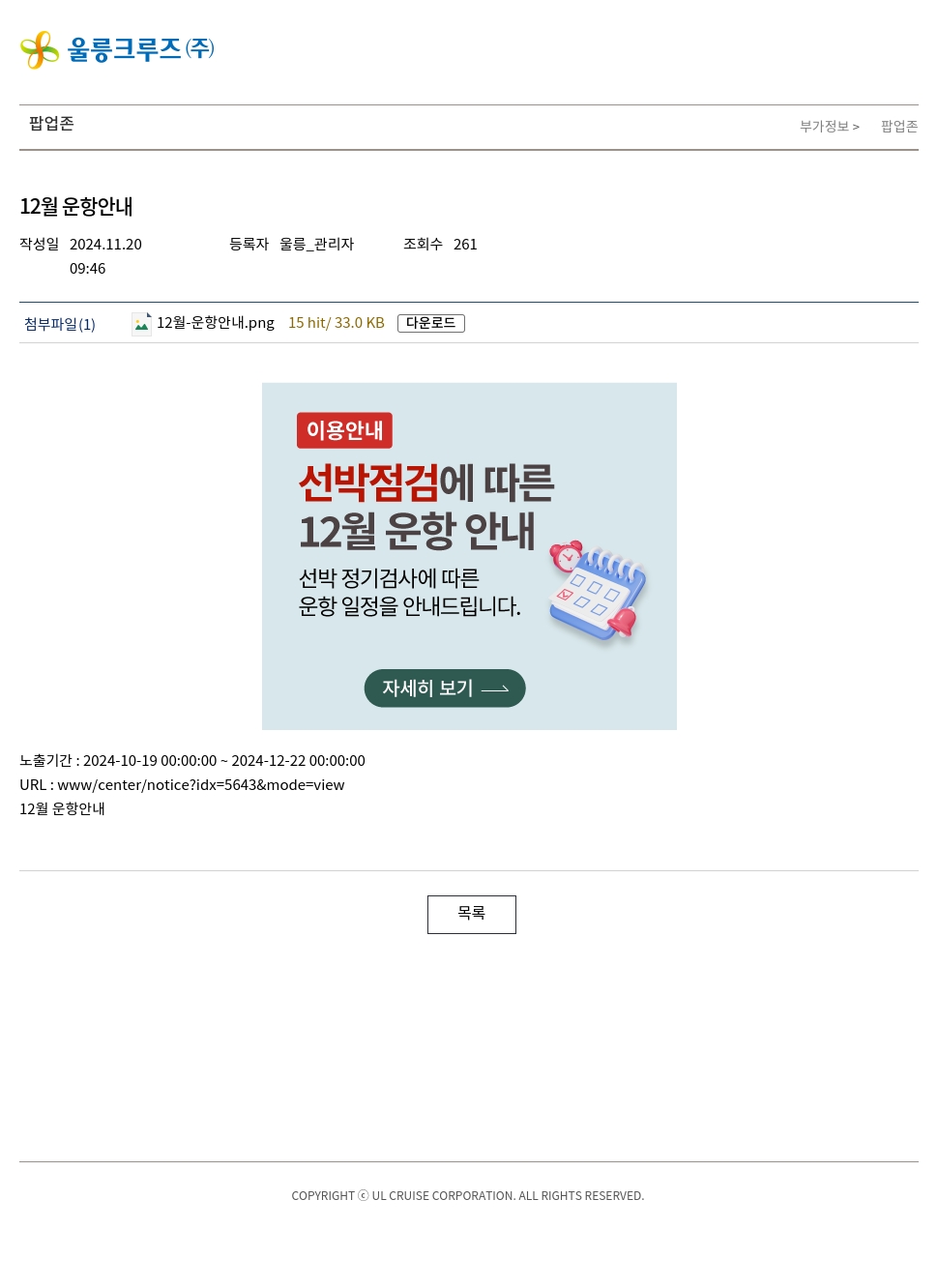 노출기간 : 2024-10-19 00:00:00 ~ 2024-12-22 00:00:00URL : www/center/notice?idx=5643&mode=view12월 운항안내