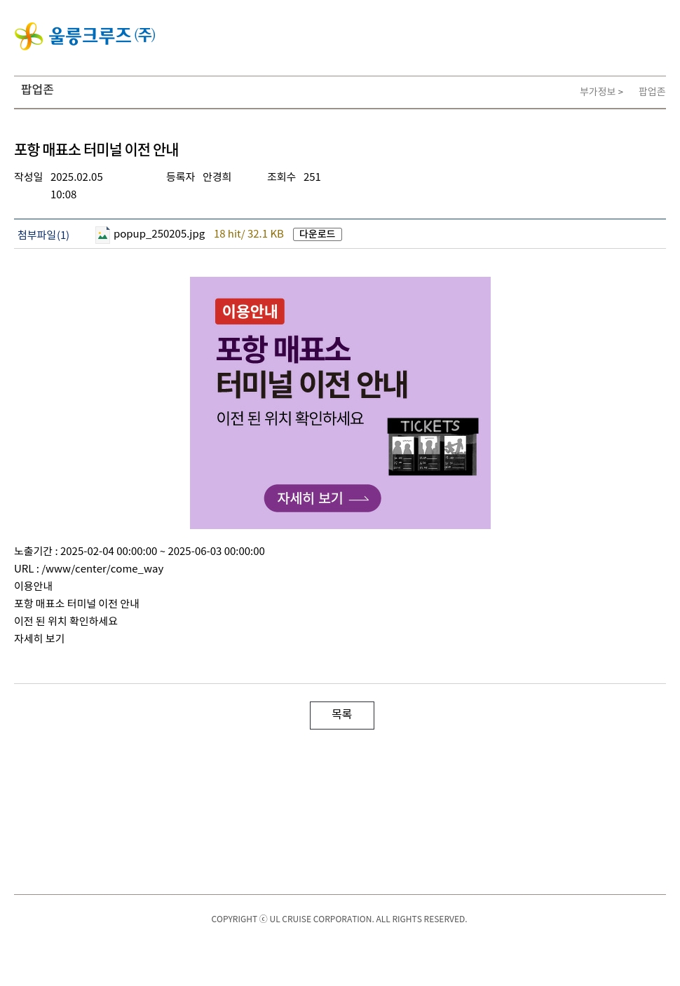 노출기간 : 2025-02-04 00:00:00 ~ 2025-06-03 00:00:00URL : /www/center/come_way이용안내 포항 매표소 터미널 이전 안내 이전 된 위치 확인하세요 자세히 보기