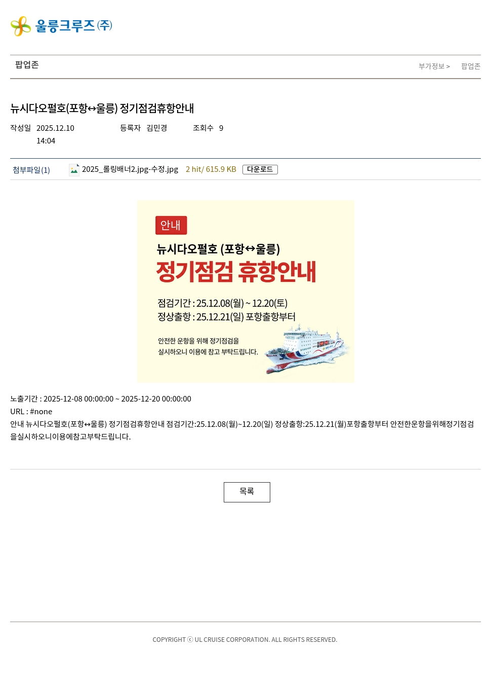 안내 뉴시다오펄호(포항↔울릉) 정기점검휴항안내 점검기간:25.12.08(월)~12.20(일) 정상출항:25.12.21(월)포항출항부터 안전한운항을위해정기점검을실시하오니이용에참고부탁드립니다.