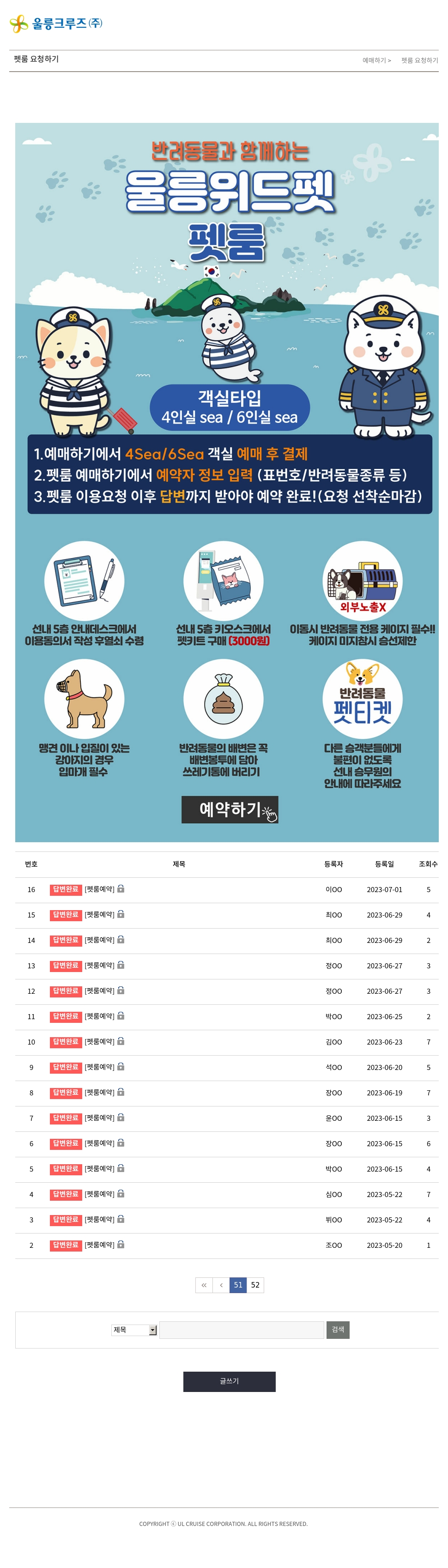 2 | 답변완료 [펫룸예약]비공개글 | 조OO | 2023-05-20 | 1 |