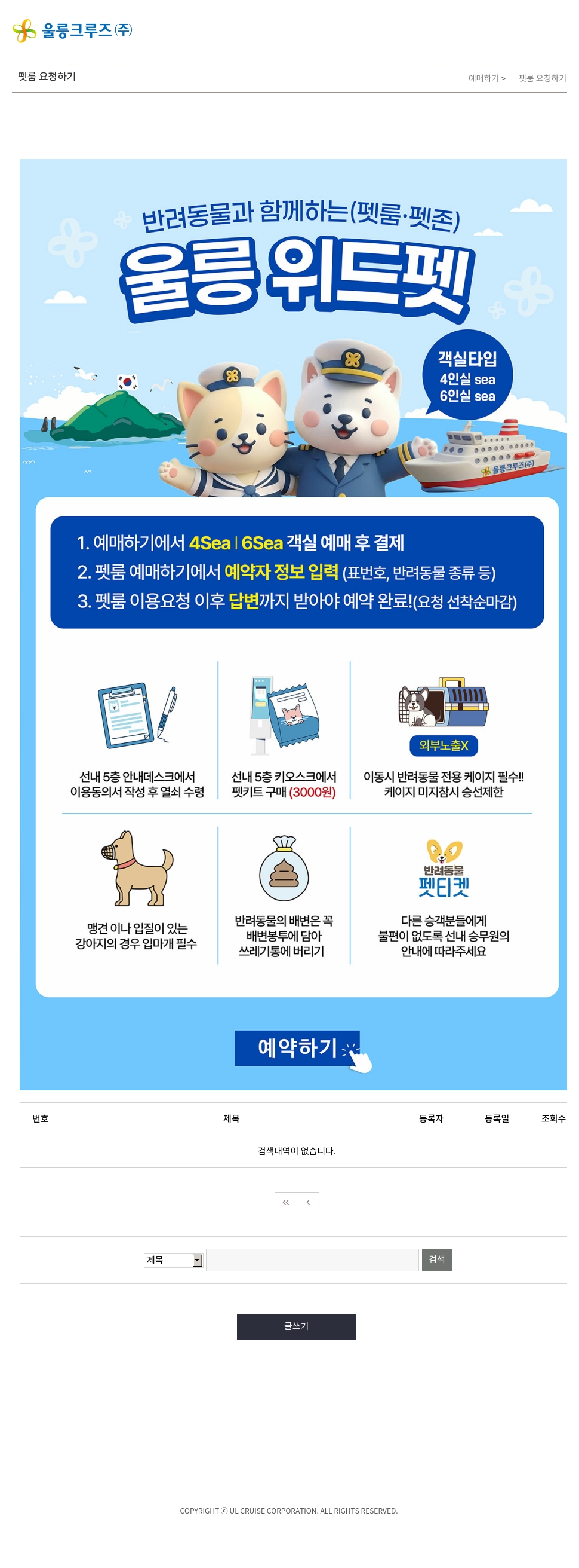 펫룸 요청하기 게시물. 총 838건, 56페이지 중 70페이지 0건 입니다. 본 데이터표는 5컬럼, 0로우로 구성되어 있습니다. 각 로우는 번호, 제목, 첨부파일, 등록자, 등록일, 조회수로 구성되어 있습니다.